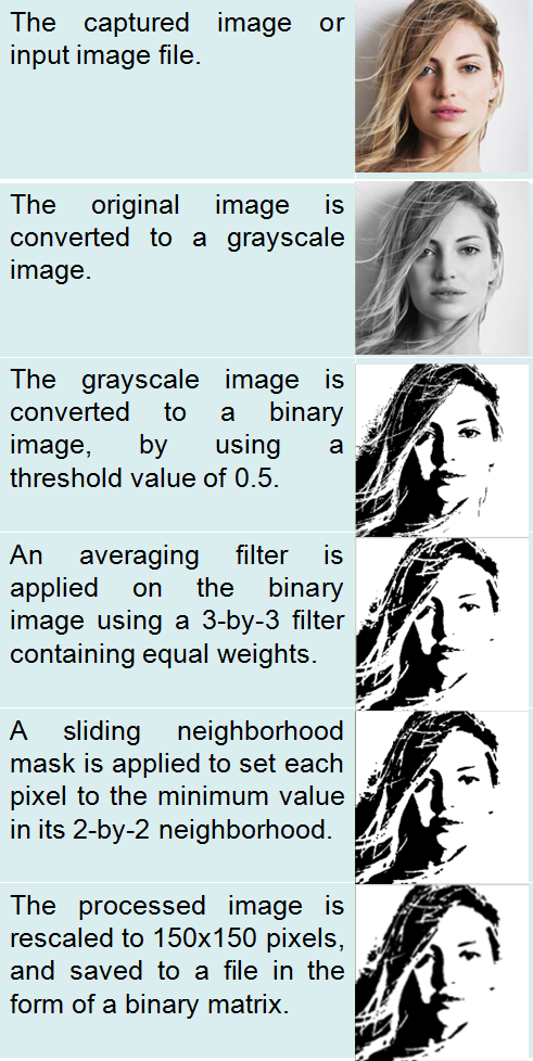The original image is captured with a camera and fed to the PC that controls the robot. The final image reproduced by the robot is of the dimensions 105x105 mm, where 2 pixels represent 1 mm. For this reason the original image has to be processed, converted to black and white, and finally resized as illustrated in the figure below.