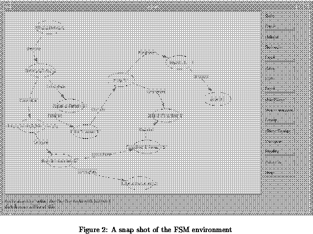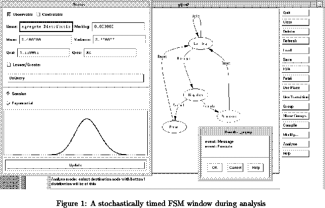 Using the environment is fairly simple. For finite state machines the designer uses the mouse to place states (represented by ovals) and connect them with events (represented by arrows). Transitions and states can be added, moved and deleted easily. Figure 1 is an example of a simple stochastically timed FSM, containing 4 states and 5 events.