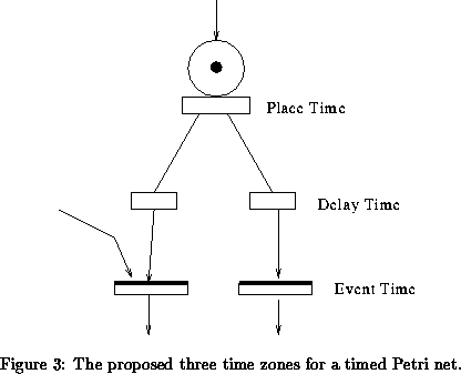 In our PN model we have extended the definition of stochastic timed Petri Nets, to have additional timings. Our model has three times associated with it, a place time, a delay time, and an event time (see Figure 3). The place time is a time where the token is held back, and delays the enabling of the transition, this represents the computation time of that place. The delay time is a time associated with the input arcs to a transition, it represents the time to leave the corresponding place. The event time is analogous to the single time in stochastic timed Petri Nets which is called firing time. We believe that this lends to a more intuitive representation of the times, and simplifies the modeling task since it captures more details than the original timed Petri net model.