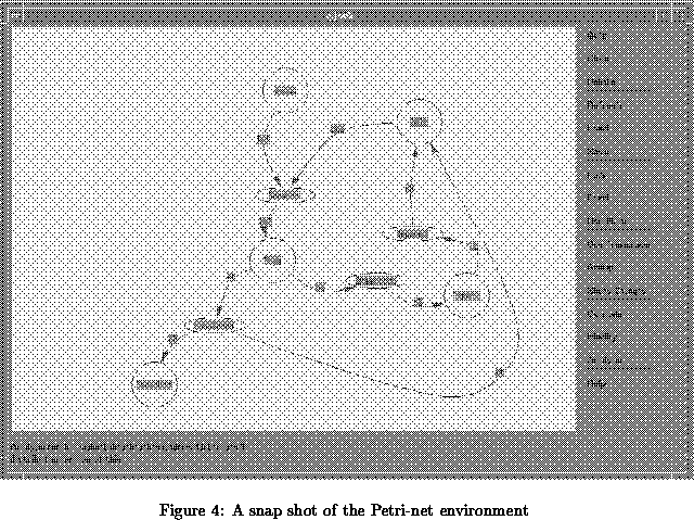 The environment for Petri-Nets is similar. Places are represented graphically by circles, transitions by ellipses, and arcs by arrows. As mentioned above, there are three locations where one can place timing information, on the events - the event time, which is the time the actual event takes, place time - when a token is moved, through a transition firing, there is a place time, which hides the token until it has expired, the final time is a delay time, this comes into effect when a transition fires, it is the time for the event to reach the transition, the event time will not start until all of its input tokens delay time has expired. Figure 4 depicts a snap shot of the Petri-Net environment in action.