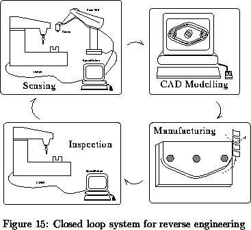 This closed loop system is the framework we used to develop an integrated CAD/CAM/sensing system for inspection and reverse engineering. The process starts by constructing an initial CAD model using 2-d and 3-d vision, then the inspection module uses this model to drive a coordinate measuring machine (CMM). The results are used to increase the accuracy of the model. Additional sensing iterations could be made until the desired accuracy is obtained. Figure 15 shows this closed loop system.