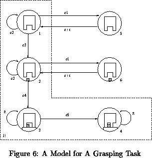 It should be noted that a DEDS representation for a manipulation task is by no means unique, in fact, the degree of efficiency depends on the designer who builds the model for the task, testing the optimality of a visual manipulation models is an issue that remains to be addressed. Automating the process of building a model was discussed in the previous section. As the observer identifies the current state of a manipulation task in a non ambiguous manner, it can then start using a practical and efficient way to determine the next state within a predefined set, and consequently perform necessary tracking actions to stabilize the observation process with respect to the set of good states. That is, the current state of the system tells the observer what to look for in the next step.