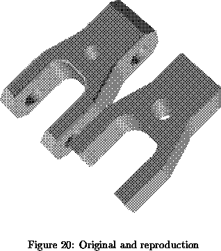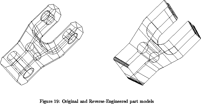 The original part and the resulting reverse-engineered part are shown in Figures 19 (wireframes) and 20 (rendered images). Notice that the two side holes and a portion of the bracket were not sensed correctly, as a simple strategy was used to sense from only one direction. In the next experiment, a more complicated model is sensed with a more sophisticated sensing and modeling strategy.