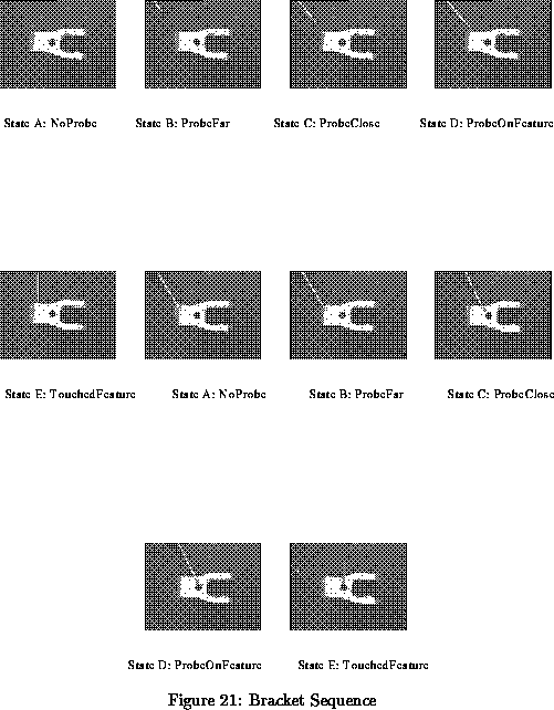 The machine was brought on line and execution begun in State A, the start state. After initiating the inspection process, the DRFSM transitioned through states until the probe reached the bracket boundary. The state machine then called for the closed region to be recursively inspected until finally, the hole was explored and the machine exited cleanly. The sequence is shown in Figure 21.